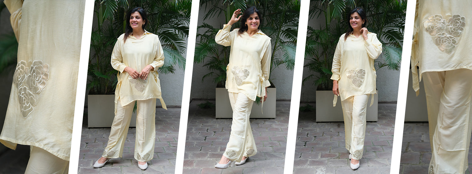 Cream Mul Cotton C-Cut Top Co-ord Set with Crosia & Embroidery Work
