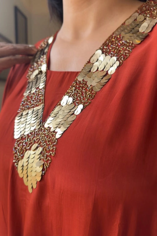 Rust Tale Cut Co-ord Set | Premium Crepe | Sequins & Thread Embroidery