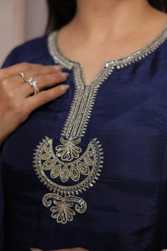 Dark Navy A-Line Kurta Dupatta Set | Pure Silk | Sequins & Pearl Embroidery Work