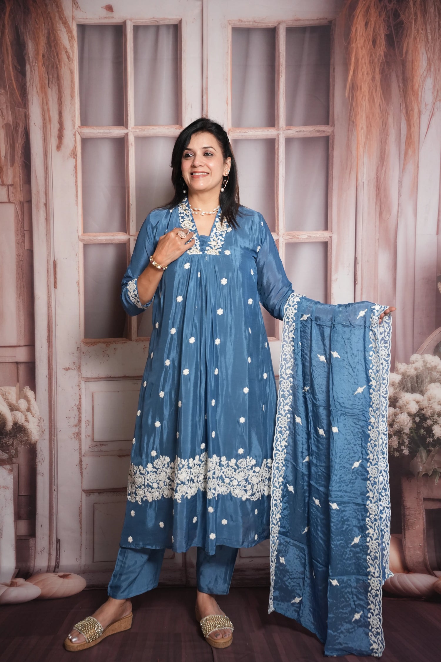 Powder Blue Lakhnavi Anarkali Kurti Dupatta Set | Intricate Lakhnavi Work