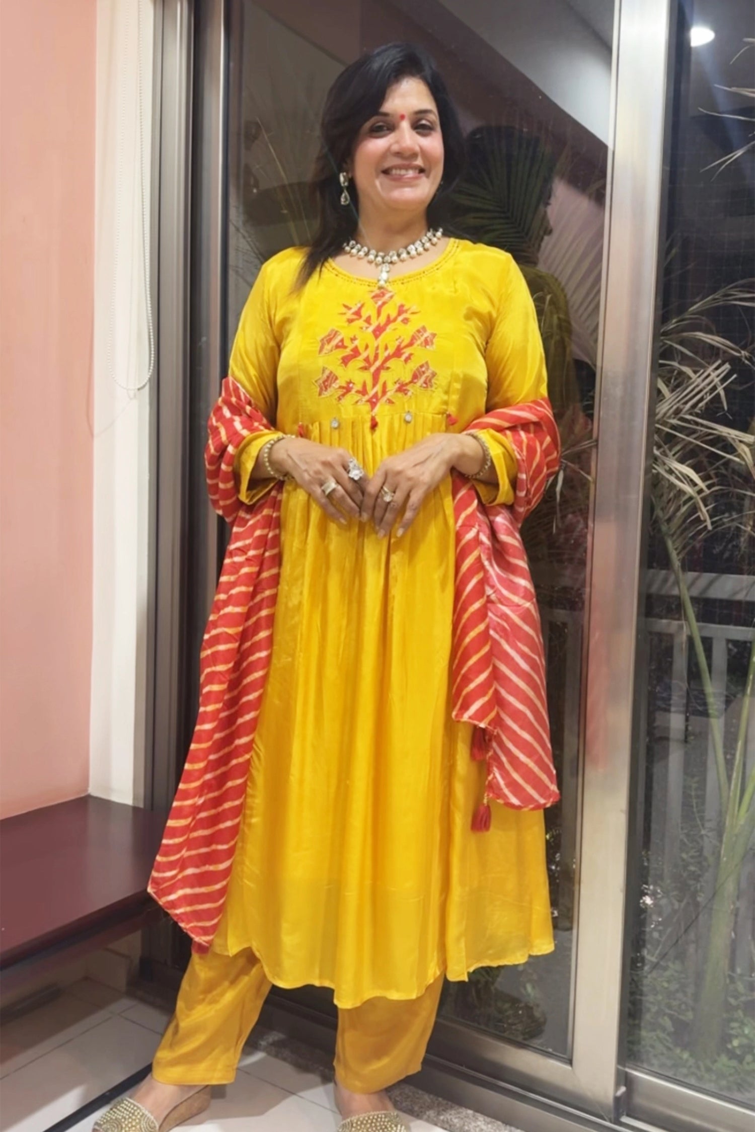 Sunshine Yellow Mul Chanderi Angrakha Style Dupatta Set with Pearl Embroidery