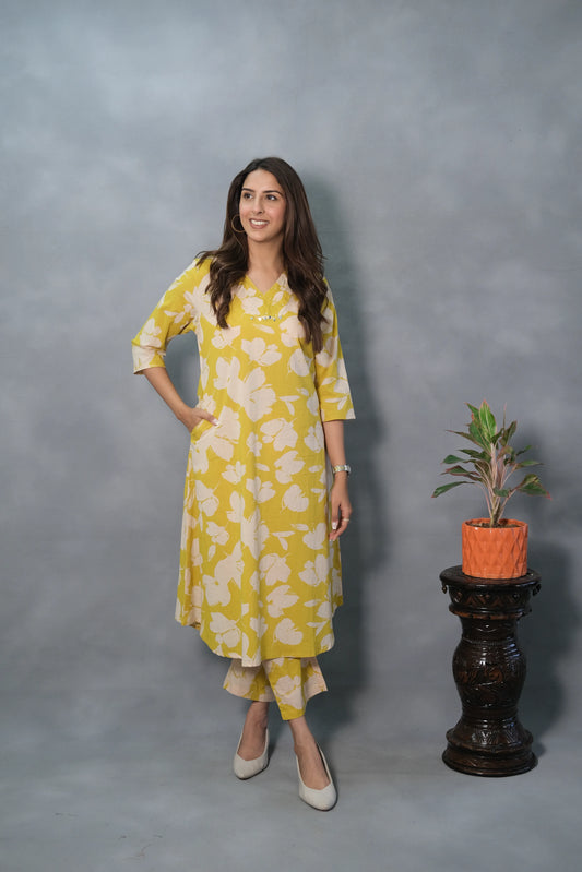 Yellow Floral Printed Kurta Pant Set | Soft Cotton