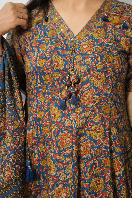 Anarkali Dupatta Set in Soft Cotton with Kalamkari & Embroidery