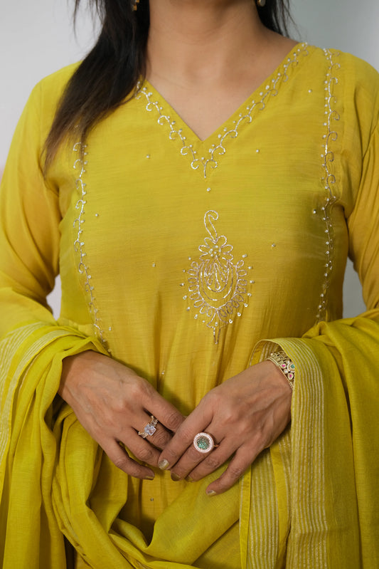 Munsell Yellow Mul Chanderi Anarkali Dupatta Set with Pearl Embroidery