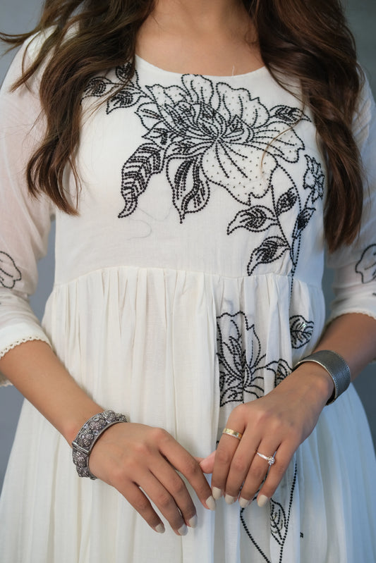 White Anarkali with Thread Work & Inner | Mul Cotton
