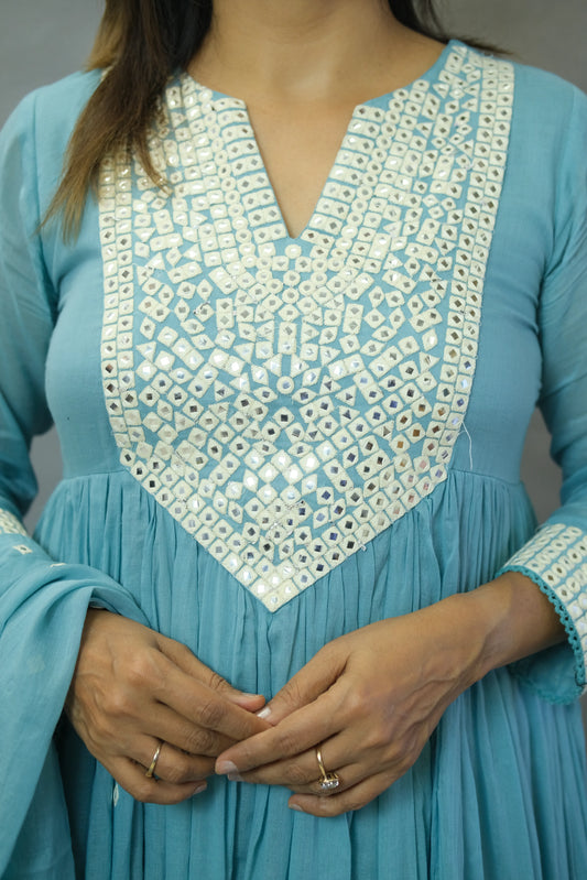 Firozi Blue Embroidered Anarkali Set in Mul Cotton | Elegant Ethnic Wear