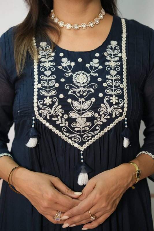 Dark Blue A-Line Dupatta Set in Mul Cotton with Embroidery – Timeless Festive Elegance