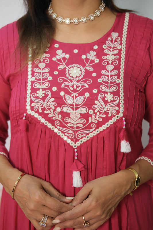 Rani Pink A-Line Dupatta Set in Mul Cotton with Embroidery – Timeless Festive Elegance