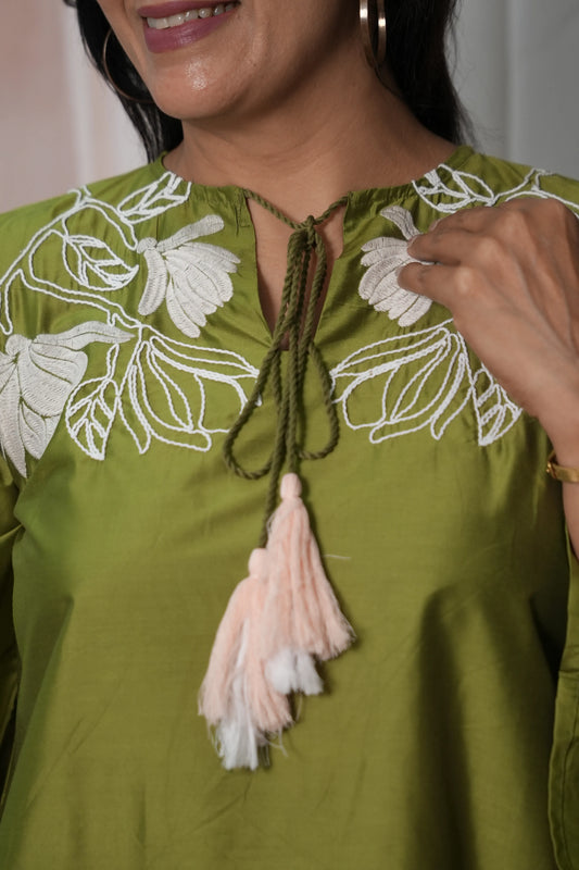 Olive Green Muslin Silk Co'ord Set with Thread Embroidery | Elegant Festive Wear