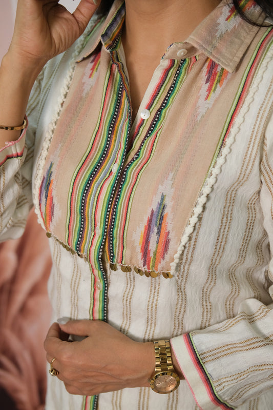 Off-White Striped Cotton Co-ord Set with Print & Embroidery