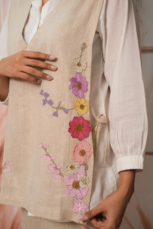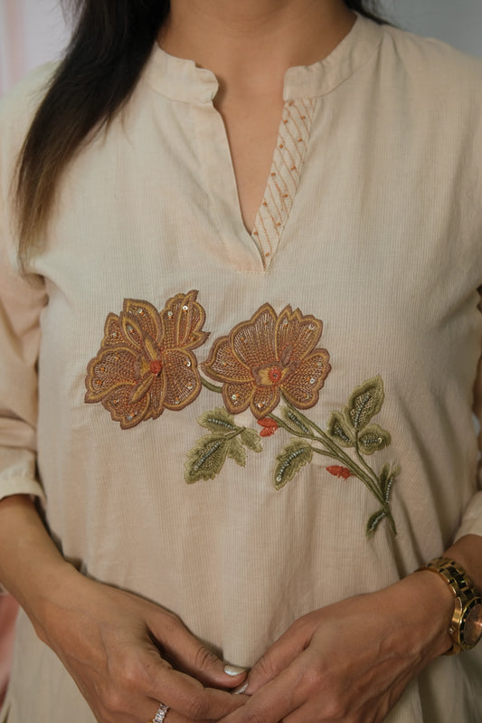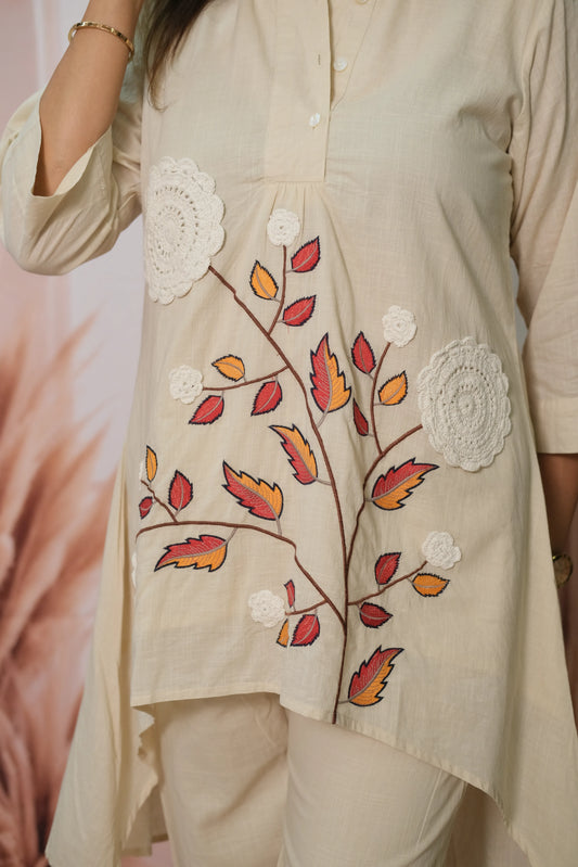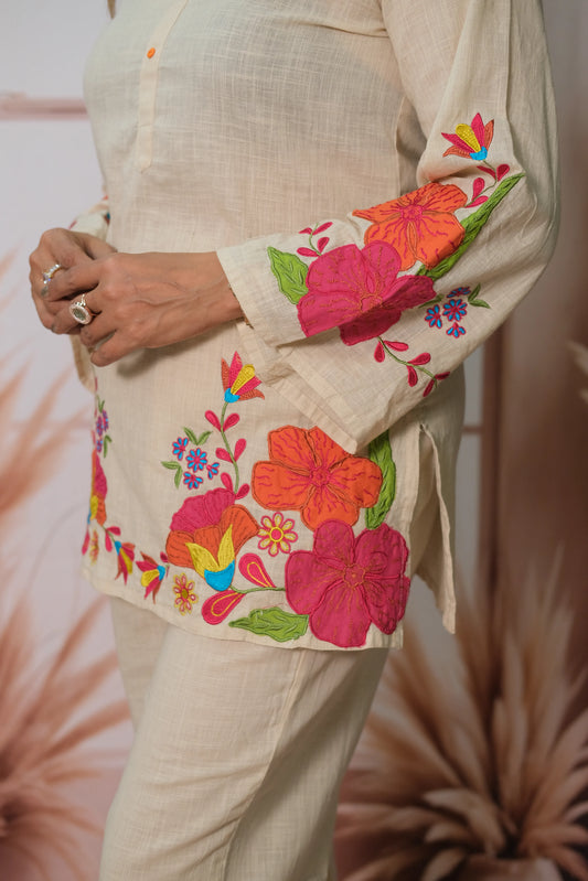 Light Beige Cotton Co'ord Set with Floral Embroidery