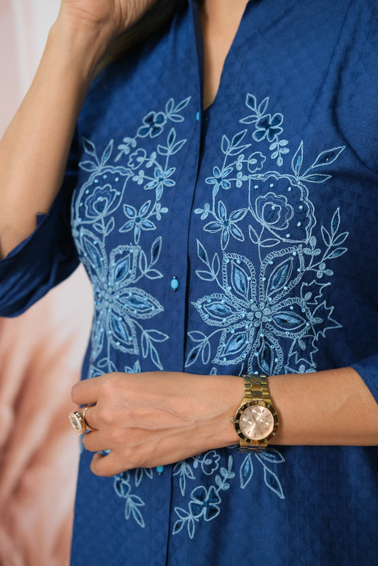 Lapis Blue Cotton Co'ord Set with Thread Embroidery