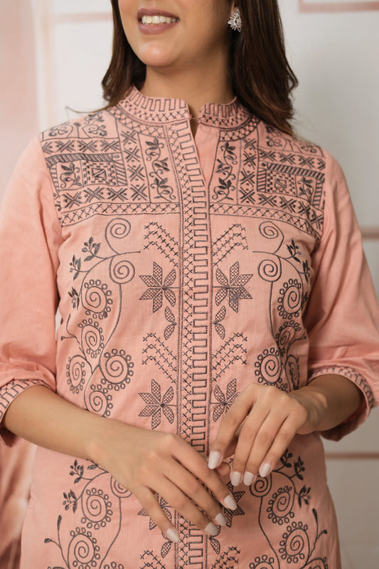 Peach Co-ord Set – Cotton Embroidered Festive Wear for Subtle Sophistication
