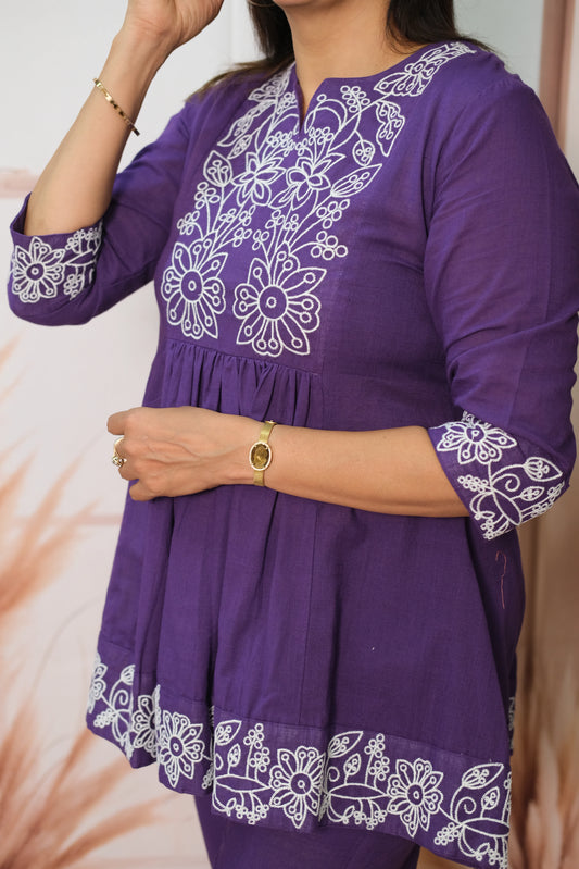 Purple Co-ord Set in Flex Cotton with Embroidery – Festive Look with Regal Charm
