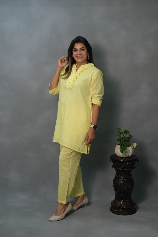 Lemon Yellow Plain Co-ord Set with Ruffle Neck | Soft Cotton