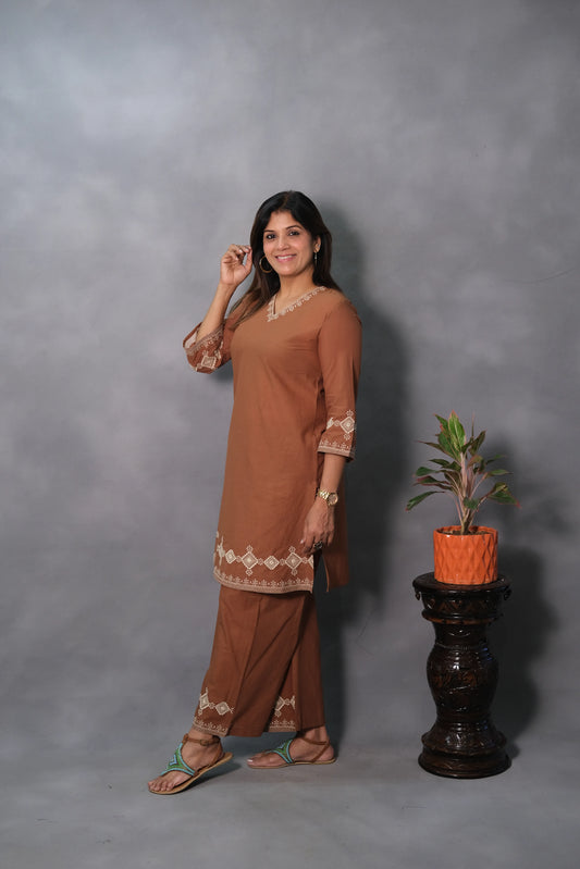 Embroidered Co-Ord Set in Soft Cotton | Chic Ethnic Wear in Brown Color