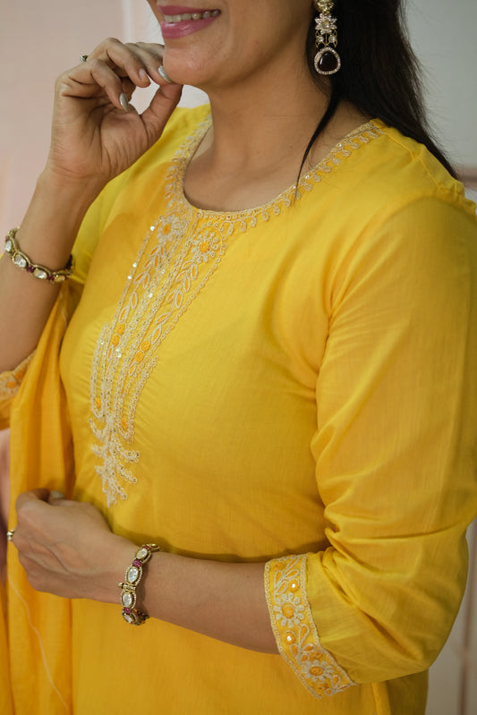 Sunshine Yellow Mul Chanderi A-Line Kurta Dupatta Set with Pearl & Sequin Embroidery