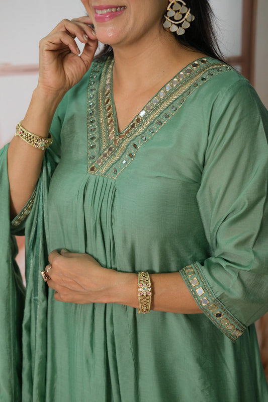 Southfield Green Mul Chanderi A-Line Kurta Dupatta Set with Mirror Work