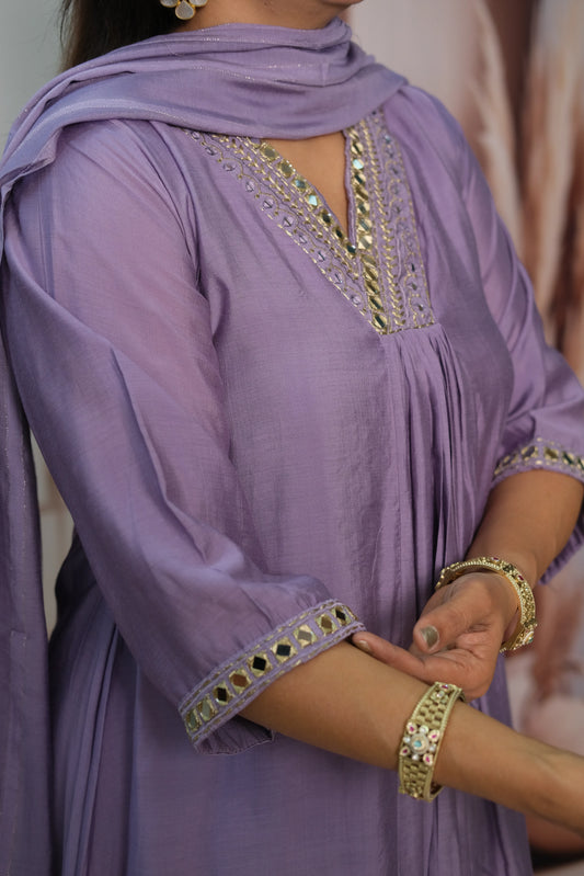 Lavender Purple Mul Chanderi A-Line Kurta Dupatta Set with Mirror Work