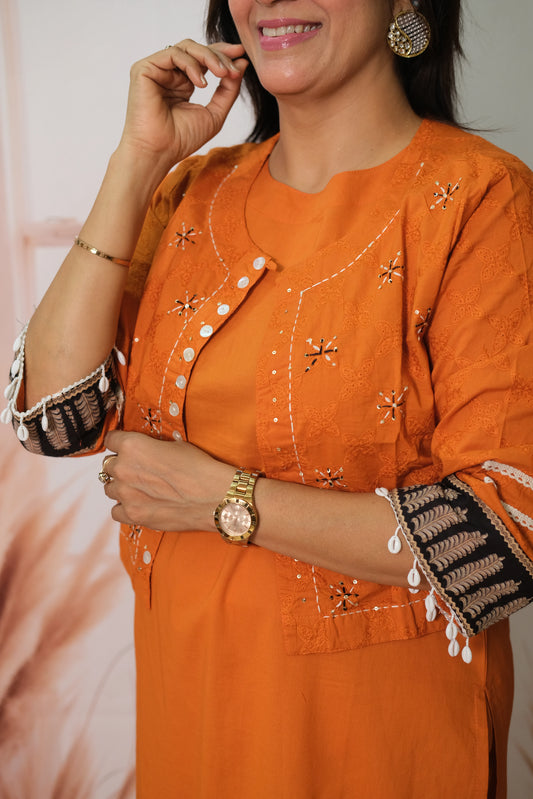 Orange Kurta Pant Set with Embroidered Koti in Soft Cotton