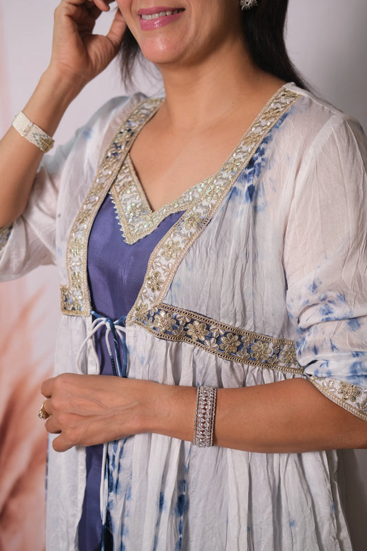 Shibori Print Mul Chanderi Kurta Pant with Shrug & Gota Patti Embroidery