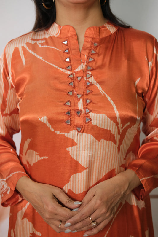 Rust Gaji Silk Kurta Pant Set with Print | Elegant Ethnic Wear for Women