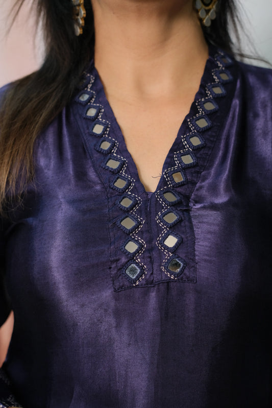 Navy Blue Gaji Silk Kurta Pant Set with Mirror Work & Print