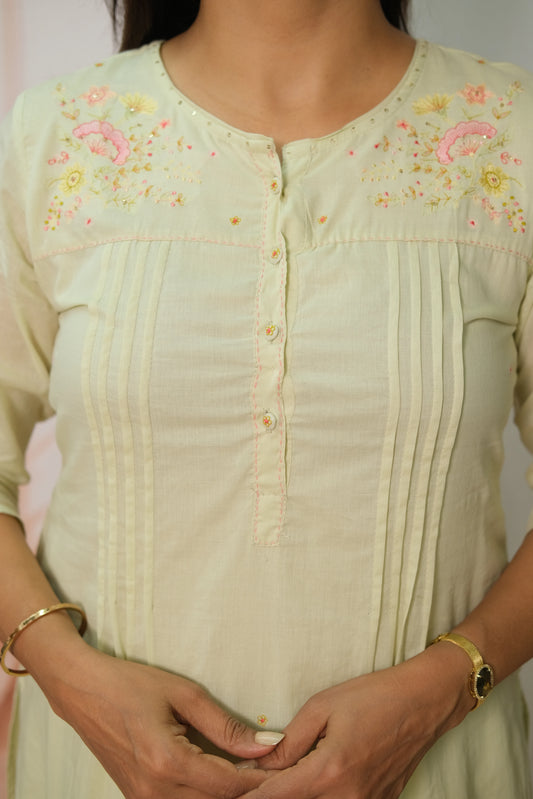 Pista Green Kurta Pant Set in Soft Mulmul Cotton with Embroidery