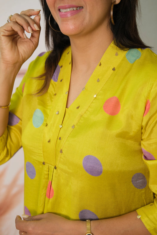 Lemon Yellow Pant Set in Muslin with Polka Dot Print – Modern Ethnic Elegance