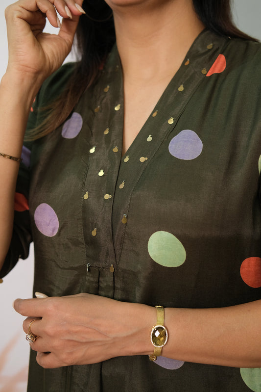 Olive Green Kurta Pant Set in Muslin with Polka Dot Print – Modern Ethnic Elegance