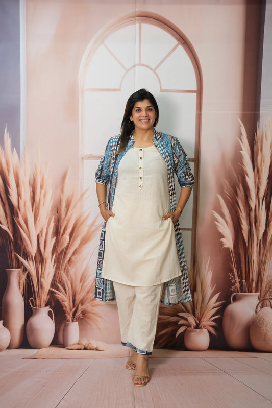 Off White Kurta Pant Set with Shrug in Flex Cotton – Printed Elegance