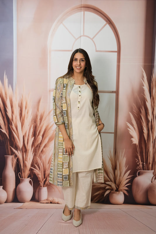 Off White Kurta Pant Set with Olive Green Shrug in Flex Cotton – Printed Elegance