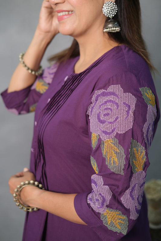 Purple Kurta Pant Set with Pintuck & Embroidered Sleeves | Mul Cotton