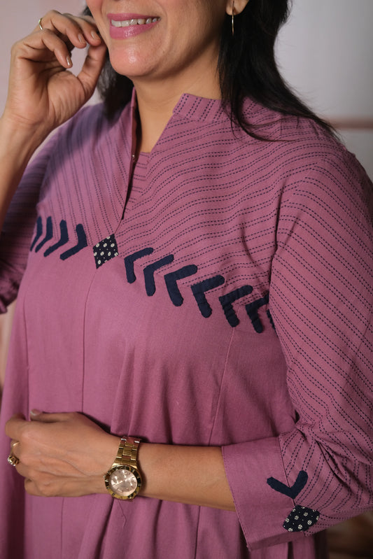 Navy Blue Muslin Long Tunic Dress | Floral Embroidery & Thread Work