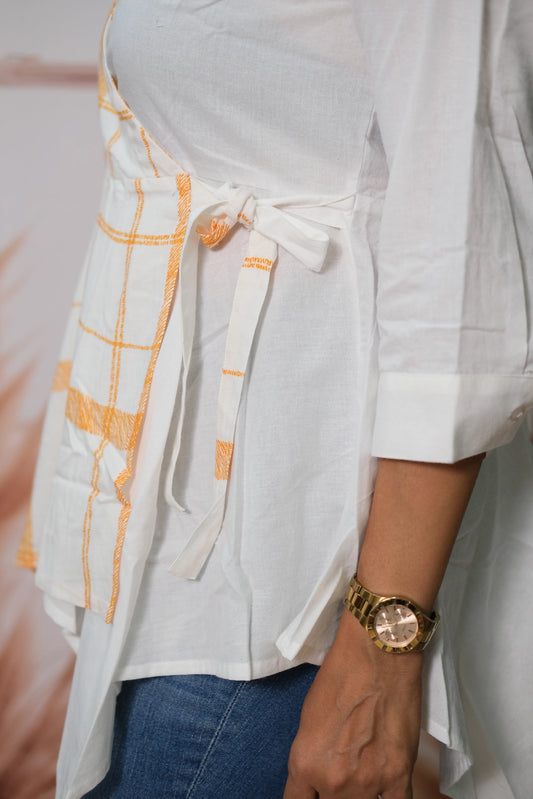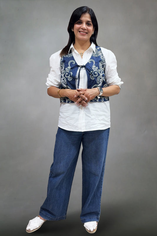 White Cotton & Denim Shirt with Embroidered Waistcoat | Contemporary Fusion Wear