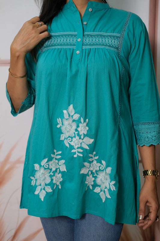 Peacock Blue Smoky Soft Cotton Short Top with Thread Embroidery