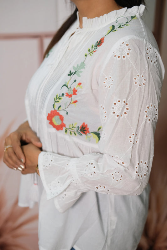 White Soft Cotton Pintex Short Top with Thread Embroidery