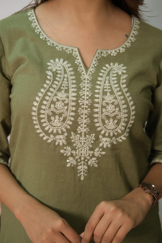 Olive Green Short Top – Flex Cotton Daily Wear with Lucknowi Work