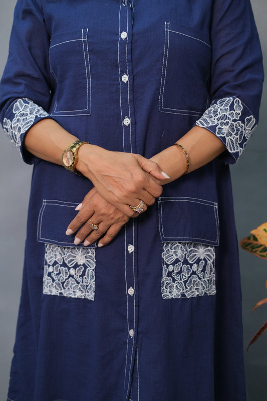 Denim Blue One Piece – Embroidered Cotton Dress for Effortless Everyday Elegance