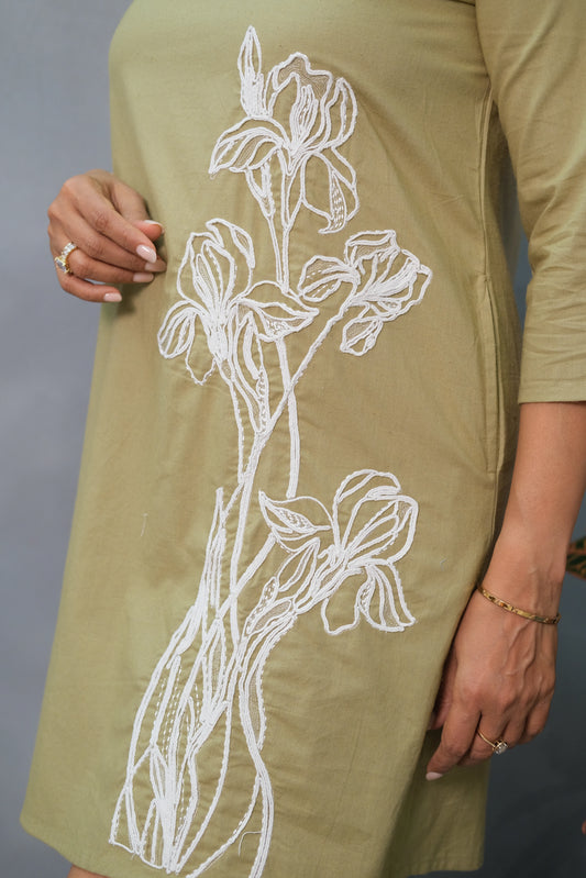 Khaki Knee Length One Piece – Embroidered Soft Cotton Dress for Bold Elegance