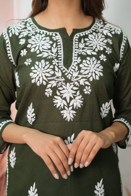 Dark Green Short Top – Mul Cotton Festive Wear with Lucknowi Work