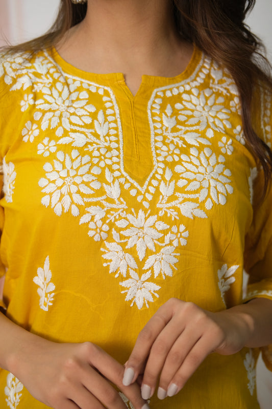 Mustard Yellow Short Top – Mul Cotton Festive Wear with Lucknowi Work