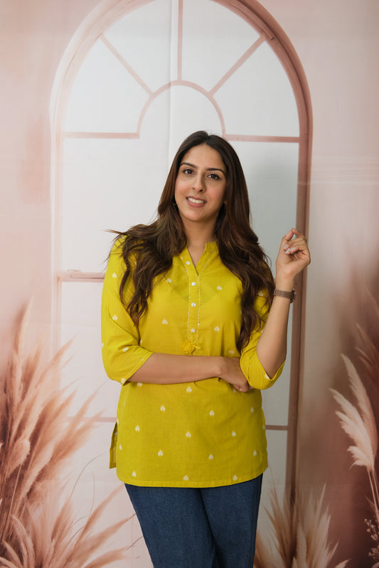 Yellow Short Top – Khadi Cotton Daily Wear with Thread Design Detail