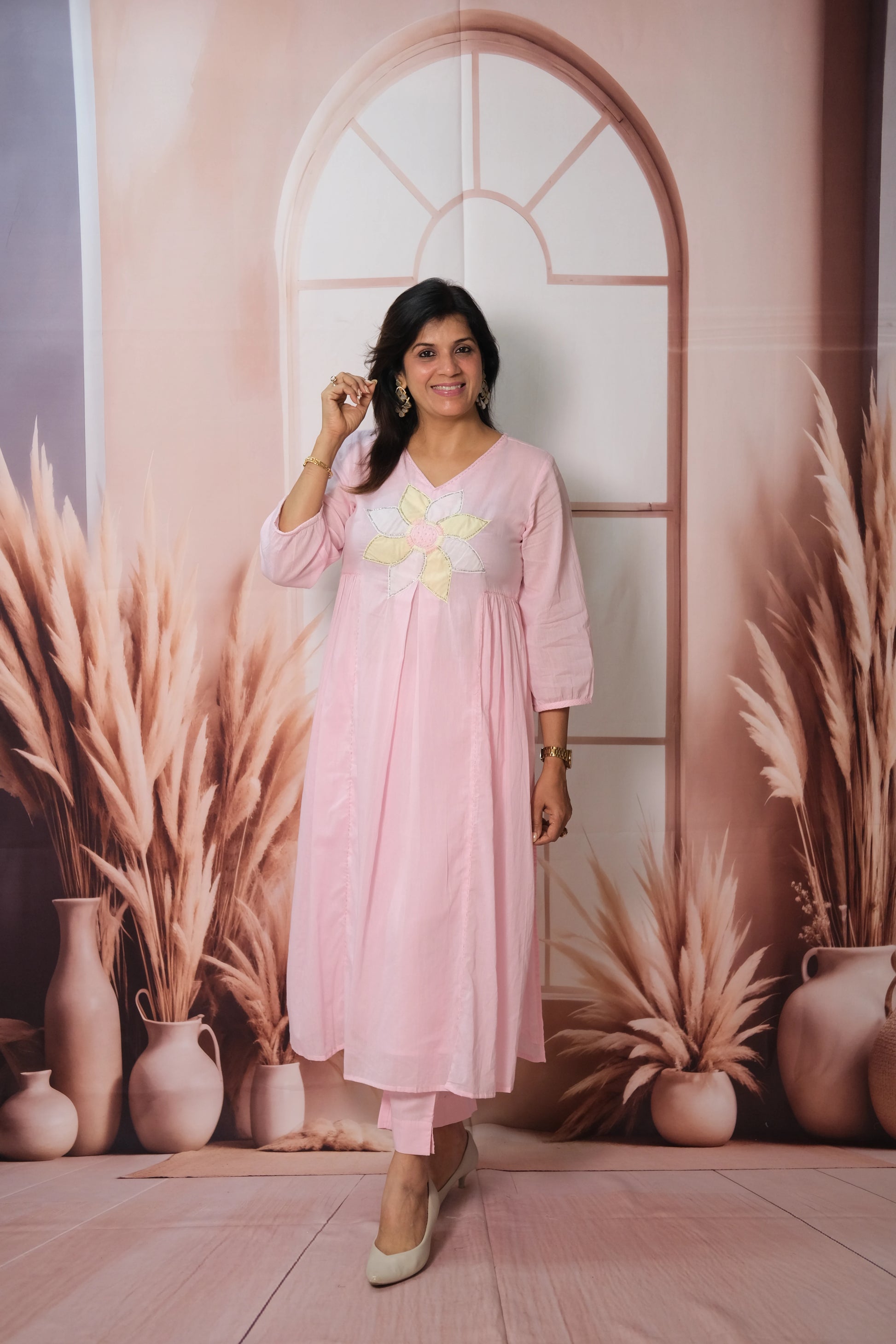 Baby Pink Kurta Pant Set – Embroidered Mul Cotton Festive Wear for Graceful Elegance