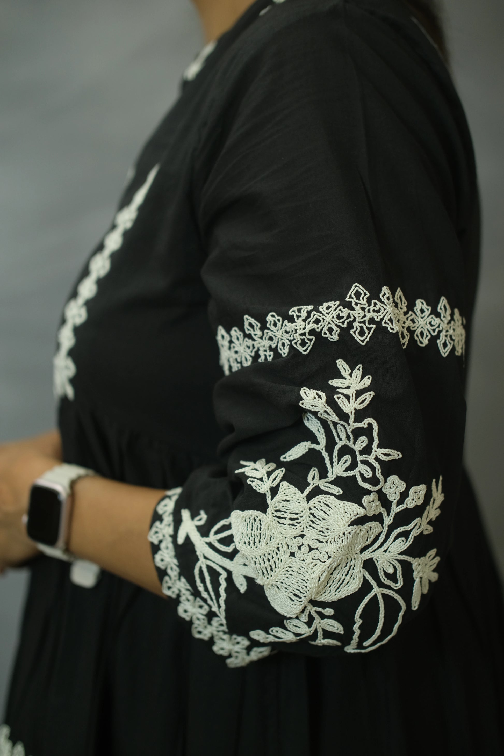 Step into effortless elegance with this Black Embroidered One Piece, designed for both comfort and charm. Featuring delicate embroidery work and functional side pockets, this dress is crafted from premium cotton fabric, making it ideal for all-day wear.