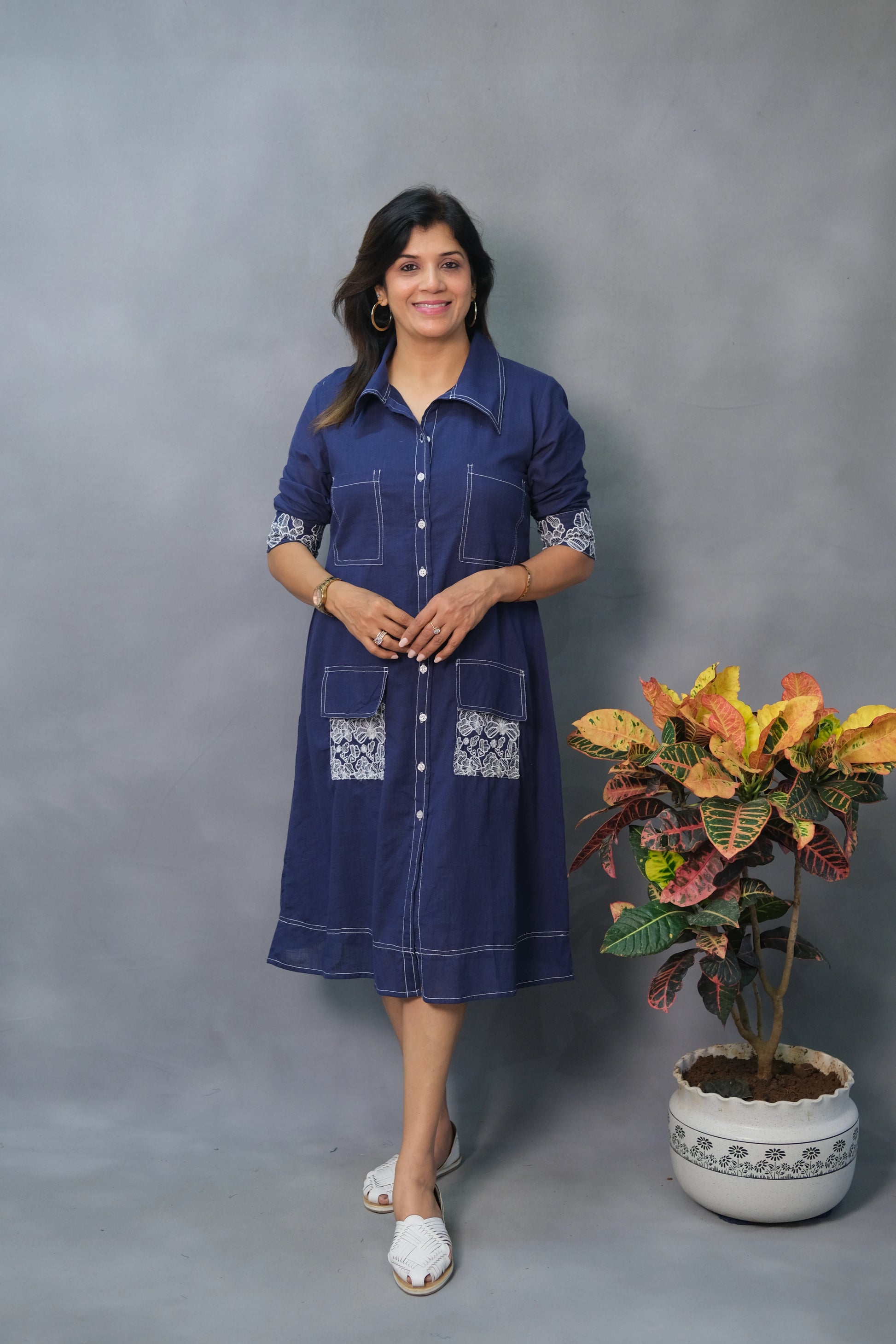 Denim Blue One Piece – Embroidered Cotton Dress for Effortless Everyday Elegance