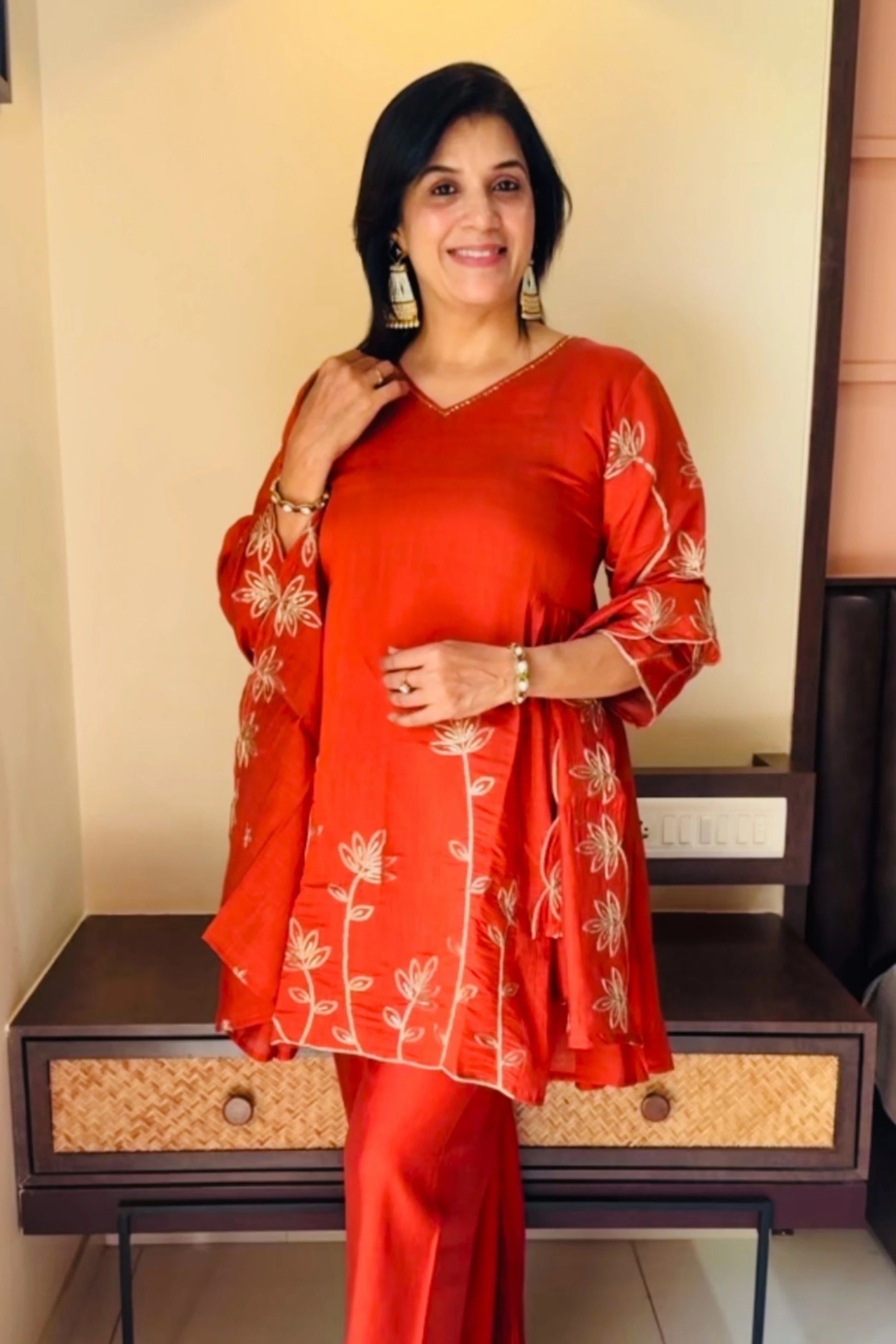 Brighten your festive wardrobe with this stunning Burnt Orange Plazo Suit Set, crafted in soft and premium mul chanderi fabric. The graceful silhouette is elevated with intricate golden adda (aari) work, giving it a rich and traditional appeal—perfect for festivals, small functions, and ethnic gatherings.