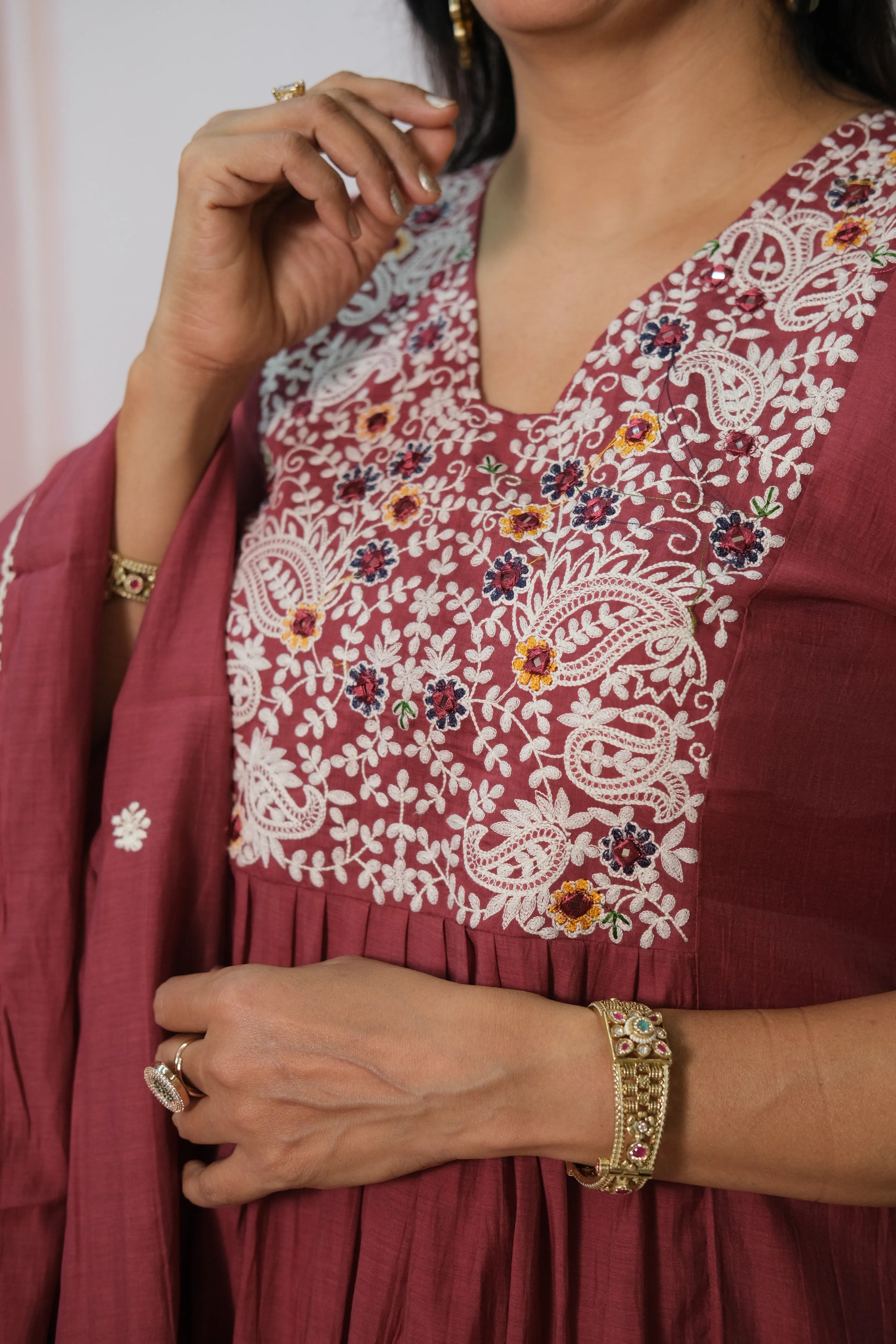 Dark Burgundy Mul Chanderi A-Line Kurta Dupatta Set with Machine Embroidery