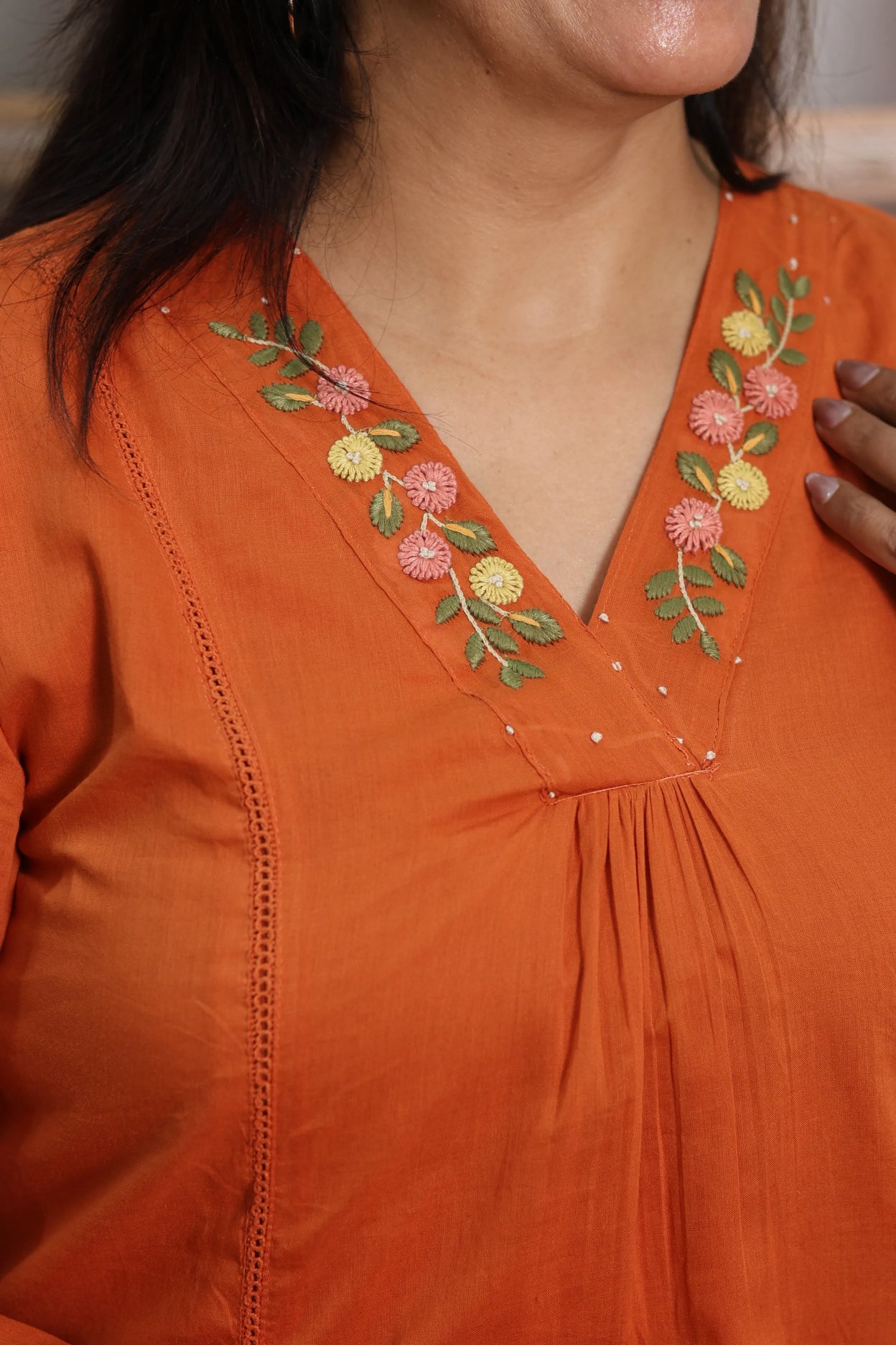 Orange Mul Cotton Kurta Dupatta Set | Thread Embroidery Design