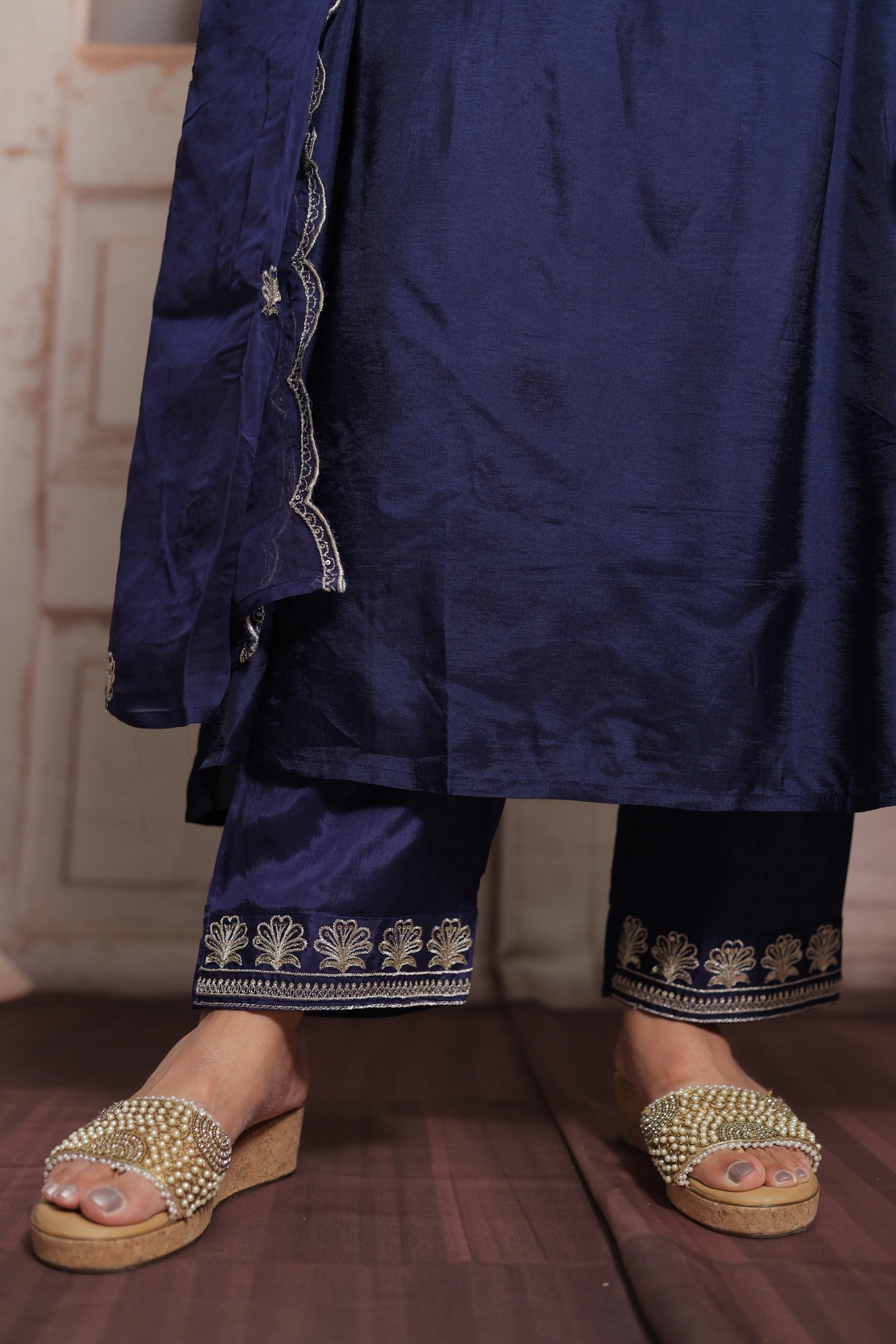 Dark Navy A-Line Kurta Dupatta Set | Pure Silk | Sequins & Pearl Embroidery Work